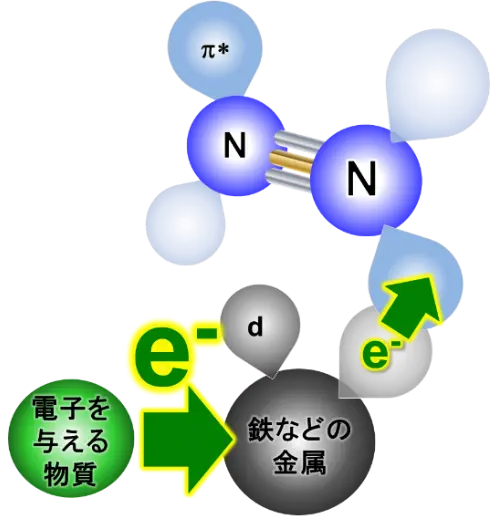 次に、上述の逆転構造で強く電子を与えられる電子供与体を開発しました。アンモニア合成の最大の難関は、窒素分子N2を窒素原子にまで分解する過程です。強固な結合で結ばれた二つの窒素原子からなる安定な窒素分子を原子にまで分解するには、鉄などの遷移金属から窒素分子へ電子を一時的に与える必要があります(図5)。しかし、遷移金属からの電子供与だけでは不十分なため、アンモニア合成触媒には金属に電子を与えて電子供与をブーストする物質、すなわち、電子供与体が組み込まれています。工業鉄触媒では酸化カリウム(K2O)がこの電子供与体に当たります。
