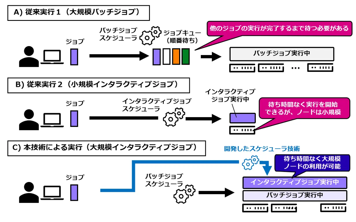 今回開発した技術(図1C)は、ユーザが投入したバッチジョブに割り当てられた計算資源を、インタラクティブなジョブへ同時に割り当てて、複数のジョブを細かい周期で切り替えながら実行可能にする技術です。本技術はユーザが利用する計算ノード上で動作するスケジューラとして実装されており、即時性と多数計算ノードによる高性能の両方を必要とするジョブを、待ち時間なく開始することができます。