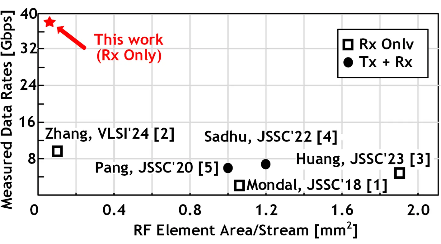 今回開発した新しい時分割MIMOフェーズドアレイ受信機を、65 nm(ナノメートル)世代のシリコンCMOSプロセスで実際に作製しました(図2左)。このICを水平・垂直の2偏波に対応する8個のパッチアンテナを有するプリント基板に実装して(図2右)、OTA測定[用語13]を行いました。その結果、64 QAM[用語14]を用いた800 MHz帯域での8ストリームのMIMO通信により、これまでのMIMOフェーズドアレイ受信機の4倍にあたる38.4 Gbpsの伝送速度を達成しました。本ICは、MIMOの1ストリーム当たりのチップ面積はわずか0.078 mm2、消費電力は5.23 mWであり、これまで発表されているミリ波MIMOフェーズドアレイ受信機を大きく上回る面積効率とデータレートを同時に実現しました(図3)。