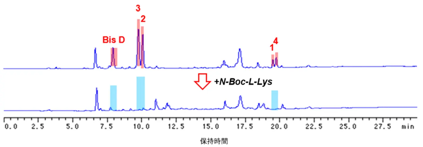 共有結合性抗がん剤シーズは、標的タンパク質ASNS内の求核性アミノ酸残基と共有結合を形成し、強力かつ持続的な作用が期待されます。今回、ASNSの求核性アミノ酸残基をリジン残基に設定し、はじめに、リジン残基反応性微生物代謝産物の検出方法の検討・確立を行いました。すなわち、ビサボスクアールD(Bis D; 本研究グループが先行研究でASNS阻害剤として報告済[参考文献])とリジン残基模倣化合物Na-(t-butoxycarbonyl)-L-lysine; N-Boc-L-Lysを反応後、生成物の化学構造を各種スペクトル解析(NMRスペクトル解析、高分解能MSスペクトルなど)により決定した結果、生成物はN-Boc-L-Lysが共有結合した化合物(BisD-N-Boc-L-Lys g-lactam)であることを明らかにしました(図2)。続いて、糸状菌Stachybotrys ruwenzoriensis RF-6853の培養抽出物とN-Boc-L-Lysを反応後、反応液を高速液体クロマトグラフィー(HPLC)で分析した結果、5つの化合物(1~4、BisD)がN-Boc-L-Lysと反応したことを確認しました(図3)。そこで、S. ruwenzoriensis RF-6853の培養抽出物から各種クロマトグラフィーを用いて化合物1~4の単離精製を行い、各種スペクトル解析(NMRスペクトル解析、高分解能MSスペクトル、X線結晶構造解析、ECDスペクトルなど)により構造解析を行いました。その結果、化合物1~3は、新規メロテルペノイド化合物であったので、スタキベンザールA~C(1~3)と命名しました(図4)。なお、化合物4は、既知化合物pre-SMTP (4)でした。