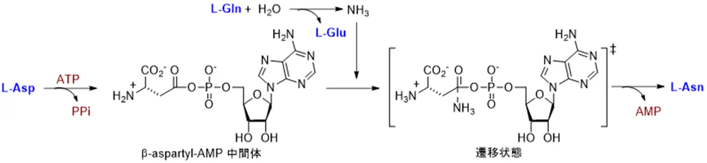 がん細胞は高い栄養要求性があり、L-グルタミン(L-Gln)やL -アスパラギン(L -Asn)などの欠乏は、肺がん、乳がん、白血病細胞、前立腺がんなどの増殖や転移を抑制します。細胞外L-Asnを低下させるL-アスパラギナーゼ[用語4]は急性リンパ性白血病(ALL)の治療薬として承認されていますが、治療に伴う細胞内アスパラギン合成酵素(ASNS:asparagine synthetase)の発現上昇による獲得耐性が大きな課題になっています。ASNSは561残基のアミノ酸からなり、N末側(1-216)にグルタミナーゼドメイン、C末側(217-561)にシンテターゼドメインを有しており、基質となるL -アスパラギン酸(L -Asp)とATPを反応させ活性なβ-aspartyl-AMP中間体を生成すると同時に、L-Glnの加水分解によって生じたアンモニアと反応させ、四面体型遷移状態を経てL -Asnを生成します(図1)。ASNSは、Asnのde novo合成を担い細胞内タンパク質合成の律速酵素であり、肺がん、前立腺がん、膵がんなどで高発現していることに加えて、抗がん剤アパチニブなどの処理時には、アミノ酸応答経路の活性化によるASNSの発現誘導が獲得耐性の主要因であることも報告されており、がん分子標的として非常に注目されています。そこで、本研究は、ASNSを標的とした共有結合性抗がん剤シーズ開発を目指しました。