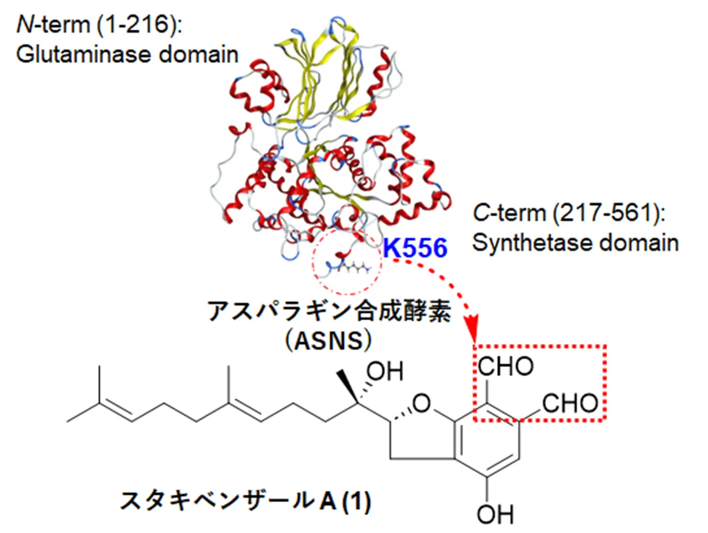 アスパラギン合成酵素(ASNS)は、L-グルタミン(L-Gln)を窒素源として、L-アスパラギン酸(L-Asp)からL-アスパラギン(L-Asn)を生合成する酵素であり、L-Asnのde novo合成[用語3]における律速酵素です。ASNSは、肺がん、大腸がん、急性リンパ性白血病などで高発現が報告されており、がんの悪性化・再発や抗がん剤耐性に寄与する酵素です。本研究グループは、共有結合性ASNS阻害剤の開発のために、リジン残基模倣化合物N-Boc-L-Lysを用いた簡便かつ高感度な評価系を構築し、スタキボトリス属の糸状菌が産生するメロテルペノイド系新規化合物スタキベンザールA~Cを見出し、ASNSの556番目のリジン残基に共有結合することで酵素活性を阻害し抗がん活性を示すことを明らかにし、がん代謝特性を標的とする新規抗がん剤開発につながることが期待されます。