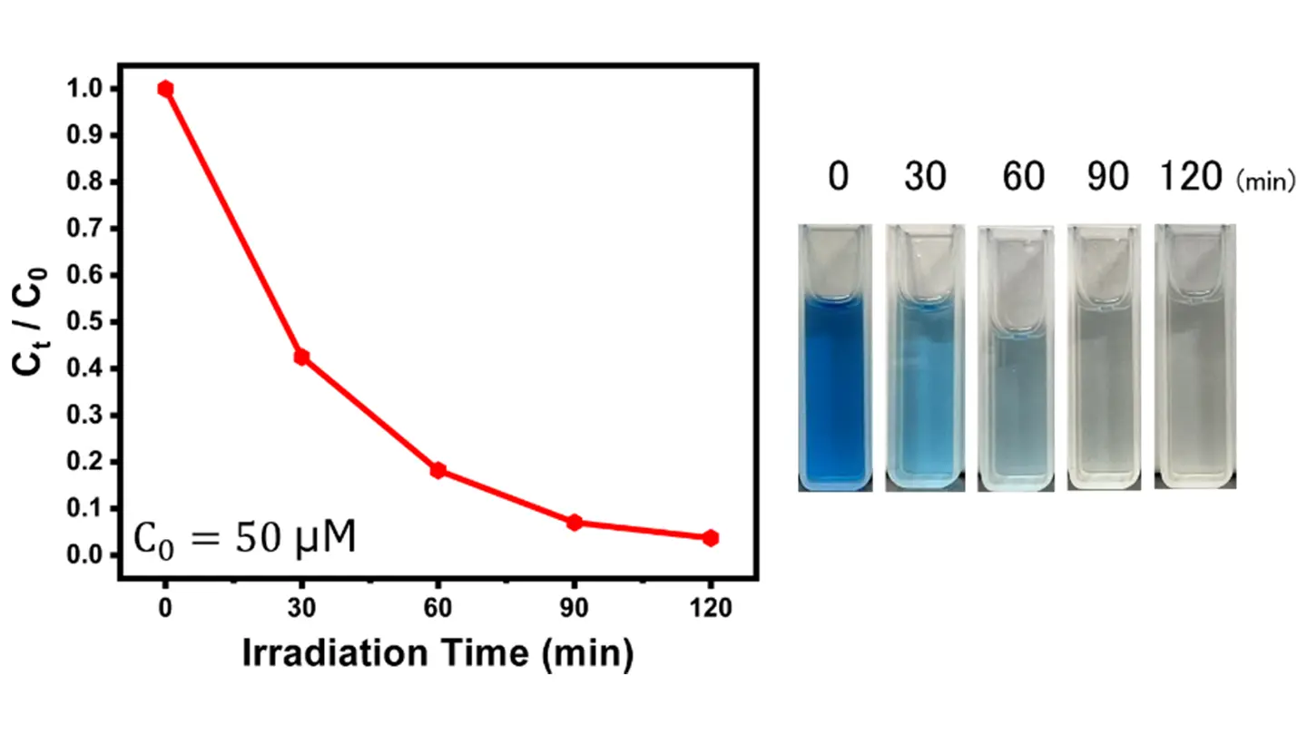 図1には、マルチフェロイック光触媒を用いた水中のインディゴ(初期濃度 40 μM)の光分解反応の結果を示しており、120分の反応後にインディゴ濃度が0に近くなることが明らかになりました。