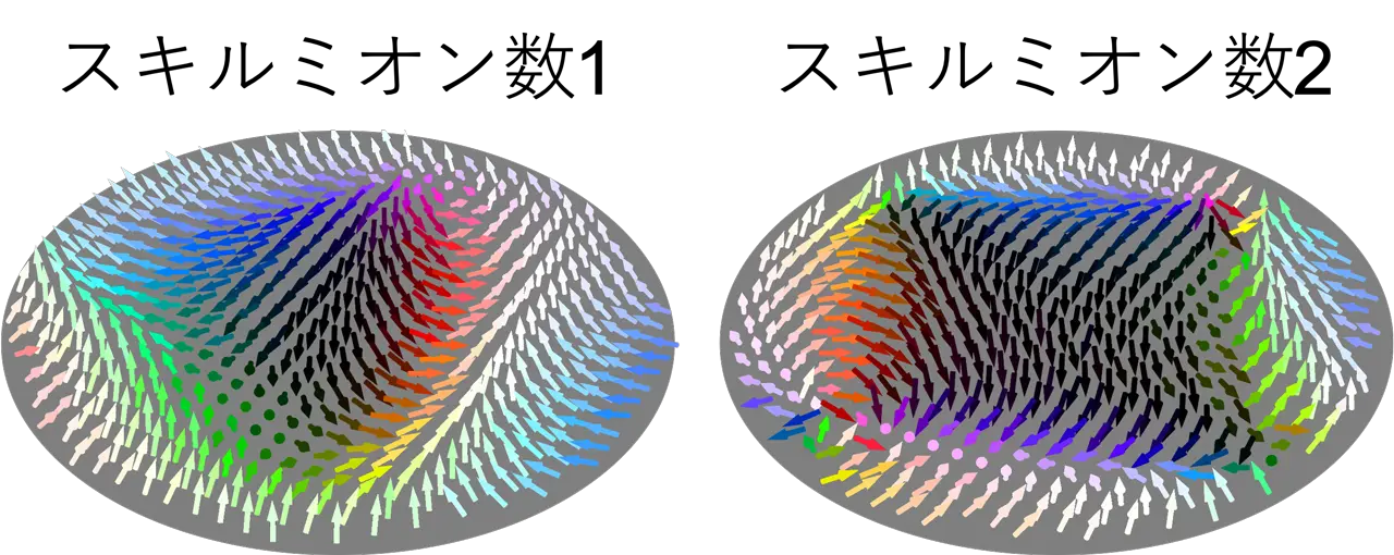 - スキルミオン:古くは素粒子分野で提唱された連続場のトポロジカルな準粒子を指します。本研究が対象としているその二次元版は特にベビースキルミオンとも呼ばれ、典型的には3成分の実ベクトルで表現される物理量が空間的に渦を巻きながら上下が反転していく構造を取ります。