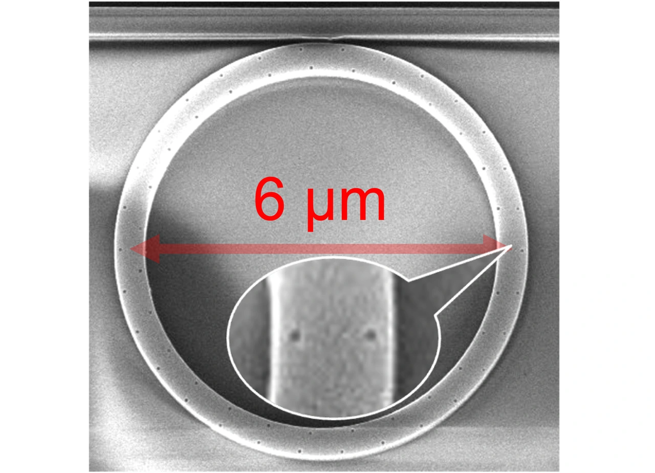 本研究では、波長程度の幅を持つ細線導波路から構成されるマイクロリング共振器[用語4]に注目しました。このような波長程度の光構造では強い光閉じ込めが生じ、その結果、光のスピン角運動量(偏光状態と対応)と軌道角運動量の間に顕著な相関が現れることが知られています。光スキルミオンはスピンと軌道、双方の角運動量を適切に制御した光ビームを2種類重ね合わせることで偏光状態の空間的な構造として現れます。本研究チームではリング共振器上の光スピン軌道相互作用が最大化される位置に2通りの回折格子を形成することでこのような光の重ね合わせが実現できることを見出しました。実際に作製された素子は高さ220 nm、幅450 nmのシリコン細線から成る半径3 µmのリング共振器で、導波路上に2重の直径60~70 nm程度の穴が方位方向に沿って2重かつ周期的に掘られています(図2)。このような2重回折格子を持つリング共振器に通信波長帯の光を入力することでスキルミオン偏光構造を持つ光が回折され、そのトポロジーは光の入射方向や回折格子の周期数によって制御されることが確認されました(図3)。