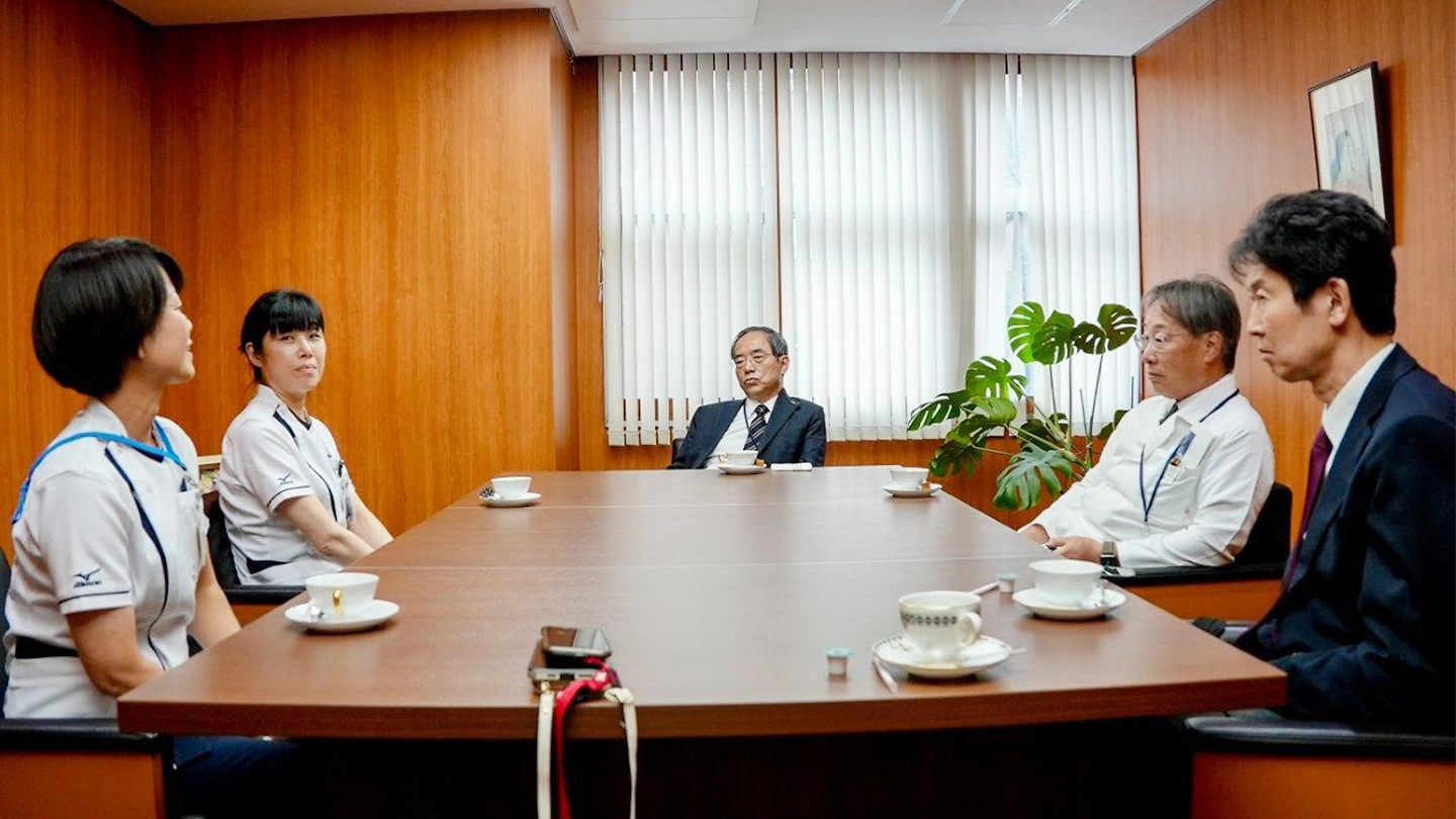 ミャンマーでの医療支援活動について田中学長、内田理事、藤井病院長へ報告する髙村副看護師長と山﨑看護師