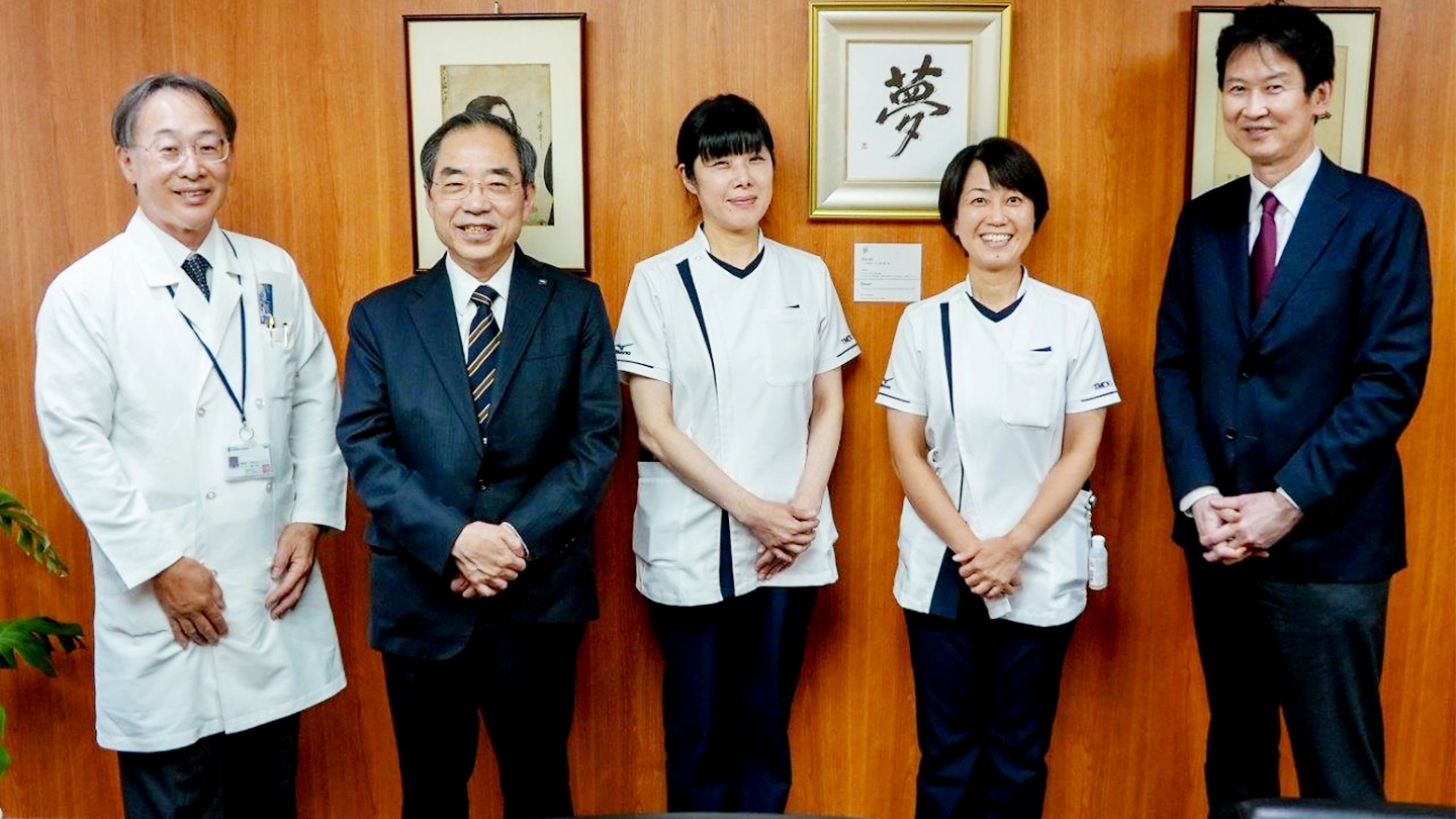 (左から)内田理事、田中学長、山﨑看護師、髙村副看護師長、藤井病院長