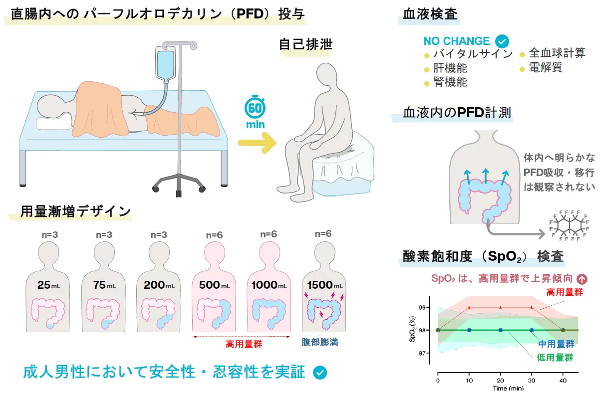 - 世界で初めて、液体酸素キャリアであるパーフルオロデカリン(PFD)を腸内に投与する「腸換気法」の安全性と忍容性を、健康な成人を対象とした臨床試験で確認しました。