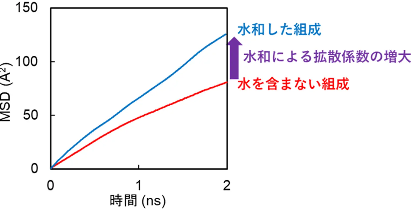 さらに、八島研の巾崎潤子研究員が中心となり、ニューラルネットワークポテンシャルを用いた分子動力学(MD)計算[用語6]を行うことで、約2nsの比較的長時間かつ297個(水和したBa7Nb4MoO20)および288個(水を含まない乾燥したBa7Nb4MoO20)という比較的多い粒子系における酸化物イオンとプロトンの拡散の挙動を初めて明らかにしました。このMD計算によっても、乾燥雰囲気に比べて湿潤雰囲気において酸化物イオンの自己拡散係数(self-diffusion coefficient)[用語5]が高いことがわかりました(図5)。