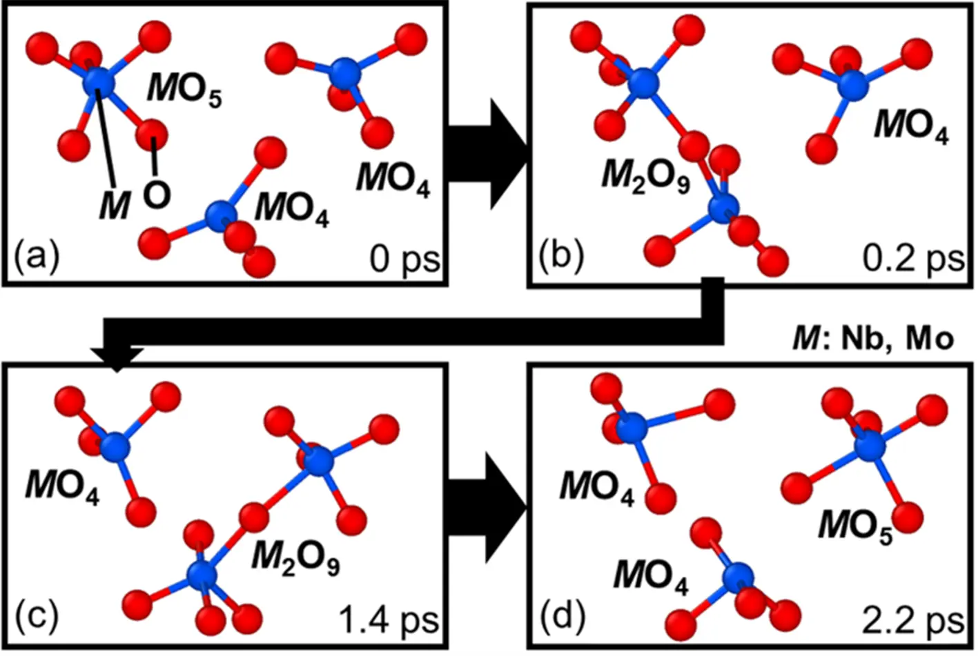 - 二量体(Nb/Mo)2O9:二量体とは同じものまたは似たものが二つくっついたものを指す。ここでは二つの四面体(Nb/Mo)O4が合わさり、かつもう一つの酸素原子Oが一つ導入されることで、二つの四面体の間をくっつけて(Nb/Mo)O4+O+(Nb/Mo)O4+O ⇄(Nb/Mo)2O9という形で二量体を形成し、消滅する。そのときもう一つの酸素原子が移動する。ここでNb/MoはNbまたはMoであることを示す。