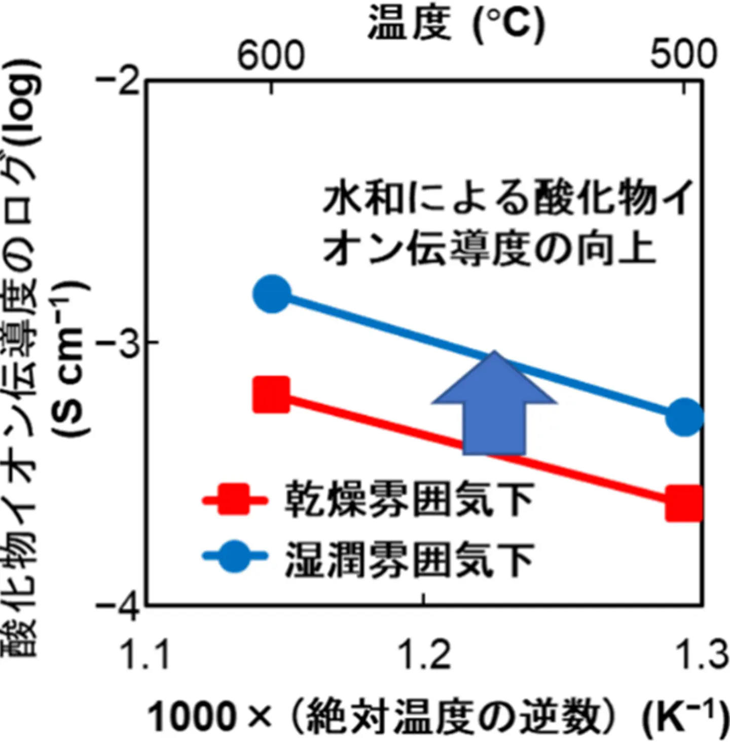 また、英国インペリアル・カレッジ・ロンドンのスキナー スティーブン(SKINNER Stephen)教授らと協力して、同位体拡散実験を行いました。その結果、乾燥雰囲気に比べて湿潤雰囲気において酸化物イオンのトレーサー拡散係数(tracer diffusion coefficient)[用語5]が高いことがわかりました(図4の四角)。すなわち、乾燥雰囲気に比べて、湿潤雰囲気において酸化物イオンの拡散係数が高い実験的な直接証拠が得られました。