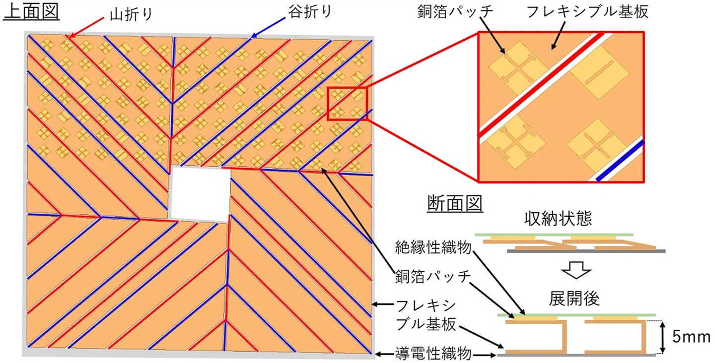 - 織物とフレキシブル基板を用いた折り紙構造により、小型収納と強い電波の両立を実現