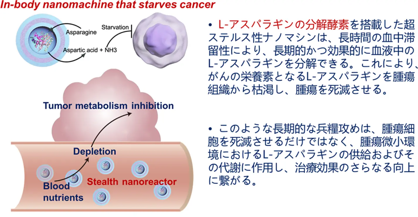 - L-アスパラギンの分解酵素であるアスパラギナーゼを搭載したナノマシンが生体内を長期循環し、がん細胞が生き延びるために必要な L-アスパラギンを腫瘍組織から枯渇