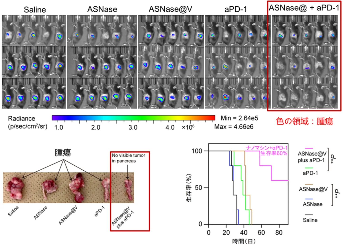- さらに膵臓がんへの薬剤(免疫チェックポイント阻害剤など)の侵入を阻む厚い間質(線維質)を破壊し、がん免疫療法との相乗効果で極めて高い有効性(長期生存)を達成