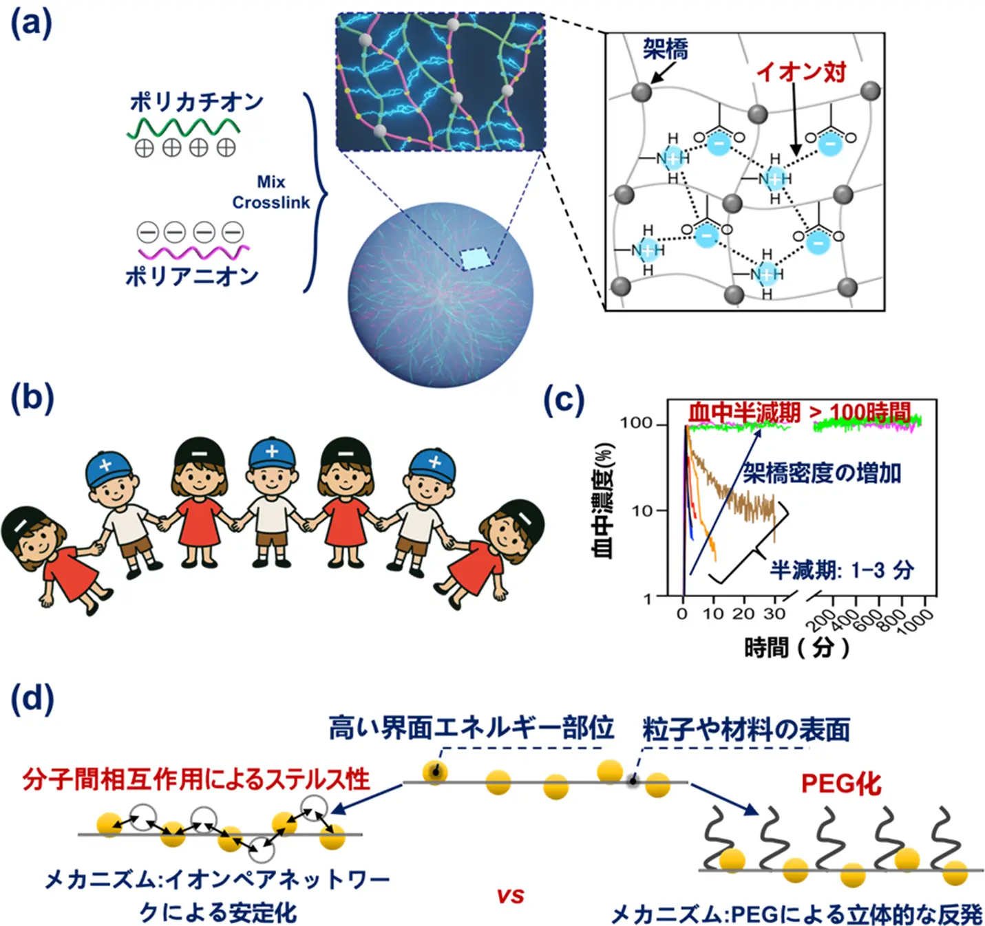 - PEGに依存しないステルスマント:イオンペア・ネットワーク。従来の「立体反発(PEG)」ではなく、ポリカチオンとポリアニオンの協働的な架橋により表面にシース状のイオンペア・ネットワークを形成。タンパク質吸着やマクロファージ取り込みを抑え、生体内半減期 >100 時間という長期循環を実現しました。