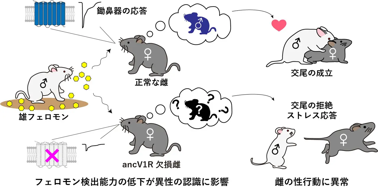 動物が交尾を成立させる上でフェロモン感覚は欠かせない。AncV1Rは鋤鼻器のフェロモン感知に重要であり、ancV1Rを欠損してしまうと、雌の性行動の異常・交配相手の接触に対するストレス応答を引き起こす。