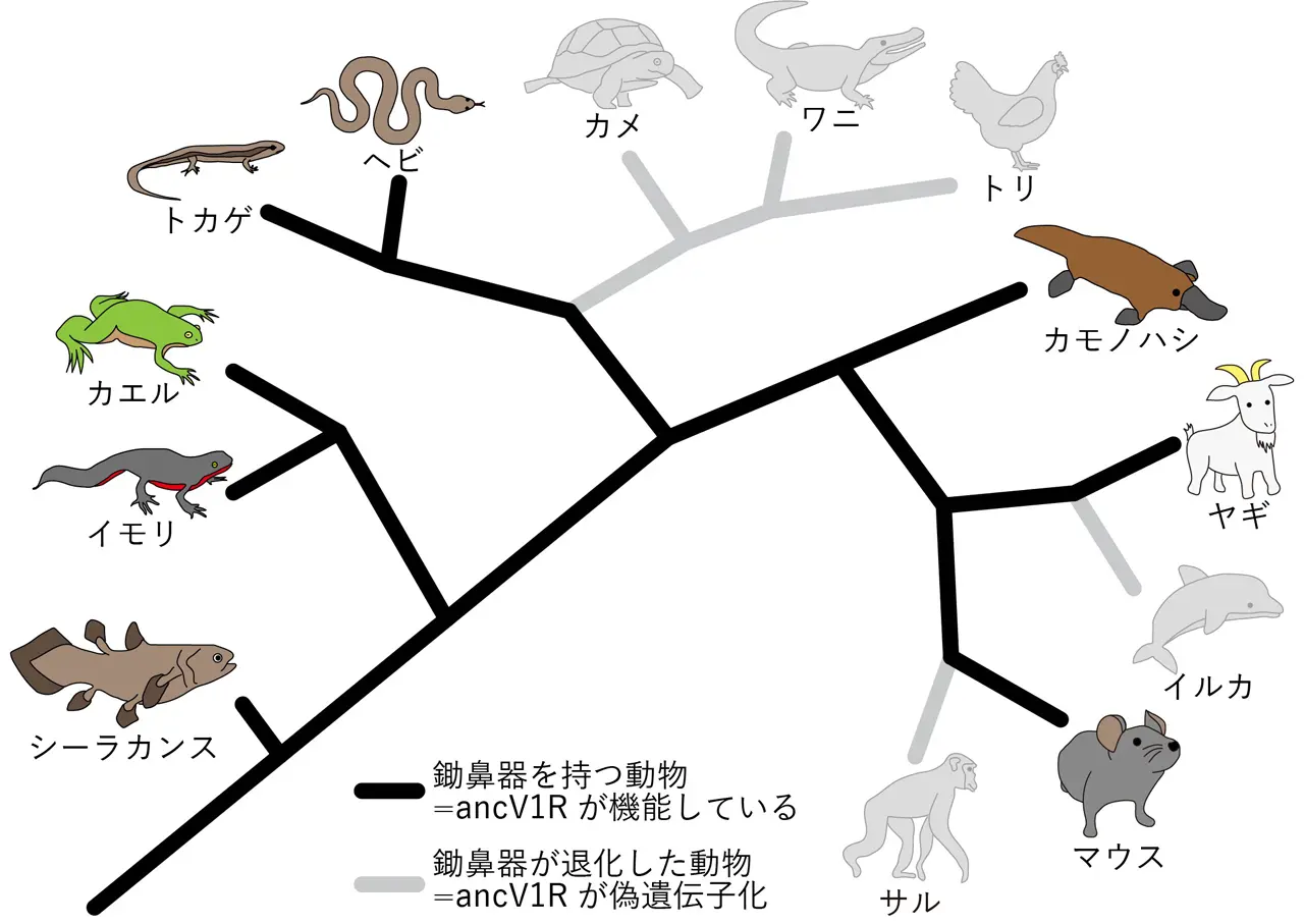 ancV1Rは古代魚から哺乳類にわたって保存される唯一のフェロモン受容体候補分子である。黒線:鋤鼻器を持つ動物種、灰色線:進化の過程で鋤鼻器が退化した動物種。ancV1Rの偽遺伝子化と鋤鼻器の退化との間に強い相関関係が認められる。