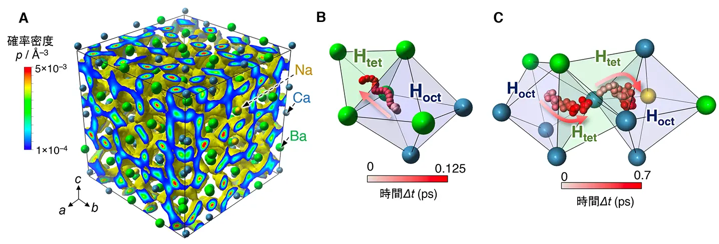 このヒドリドイオン伝導体について、高強度陽子加速器施設J-PARCでの中性子回折実験[用語6]により、重水素置換体[用語7]の結晶構造を解析した結果、Ba、Ca、Naがランダムに体心立方格子位置を占有し、重水素が四面体位置(12d)と八面体位置(6b)に無秩序に分布した構造を持つことが判明しました(図1B)。また、固体NMR測定[用語8]により、ヒドリドイオン輸送のダイナミクスを捉えることに成功しました。さらに、東京科学大学のTSUBAME4.0スーパーコンピュータ[用語9]を用いて、メッセージ伝播ニューラルネットワーク(MPNN)ポテンシャル[用語10]という高精度かつ比較的大規模な分子動力学(MD)シミュレーションを行い、ヒドリドイオンが四面体–八面体サイト間を協調的に移動し、三次元の拡散経路を持つことを明らかにしました(図2A-C)。