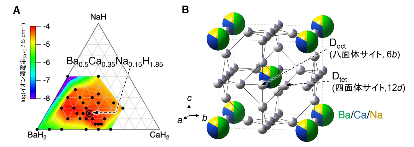 本研究では、高い電気化学安定性とイオン伝導性を併せ持つ固体電解質の開発を目指して、サイズと価数が異なる金属であるBaH2とCaH2、NaHを混ぜることで、新たなヒドリドイオン伝導体を探索しました。広範な組成の材料探索を通じた最適化により、組成式Ba0.5Ca0.35Na0.15H1.85が、超イオン伝導体であるα-AgIと同様の構造を形成することを発見しました。この新材料は、25℃で2.1×10–5 S cm–1という高いヒドリドイオン伝導性を示しました(図1A)。