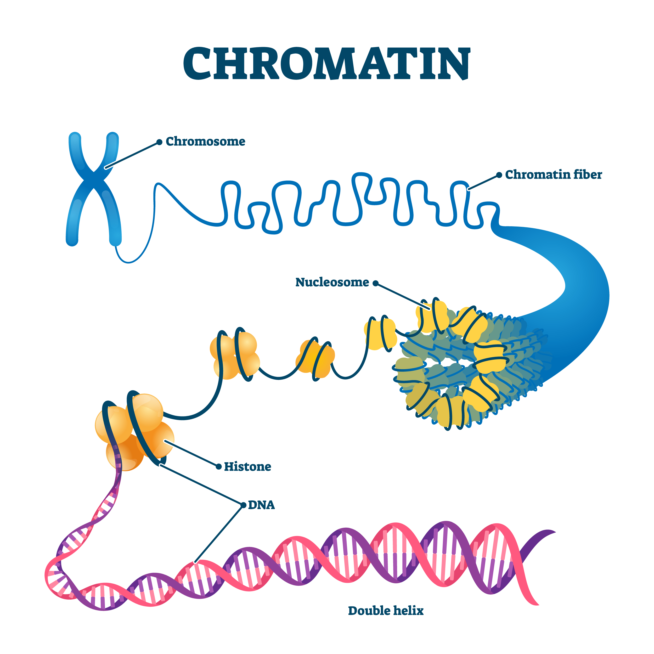 DNAは、とても長い鎖状の物質で、そのままだと細胞に綺麗に収納できません。そのため、ヒストンという「巻き芯」の役割を果たすタンパク質に巻き付いてヌクレオソームと呼ばれる「DNAの基本収納ユニット」を形成し、そのユニットを整然と並べてクロマチンと呼ばれる構造体として、細胞内に収納されるのです。これを染色体とも呼びます。