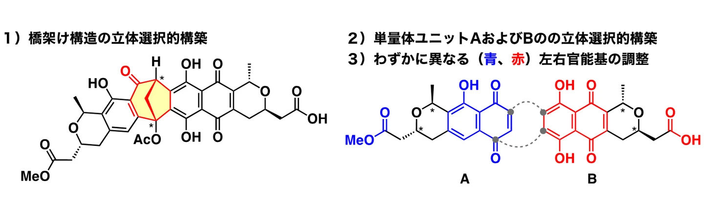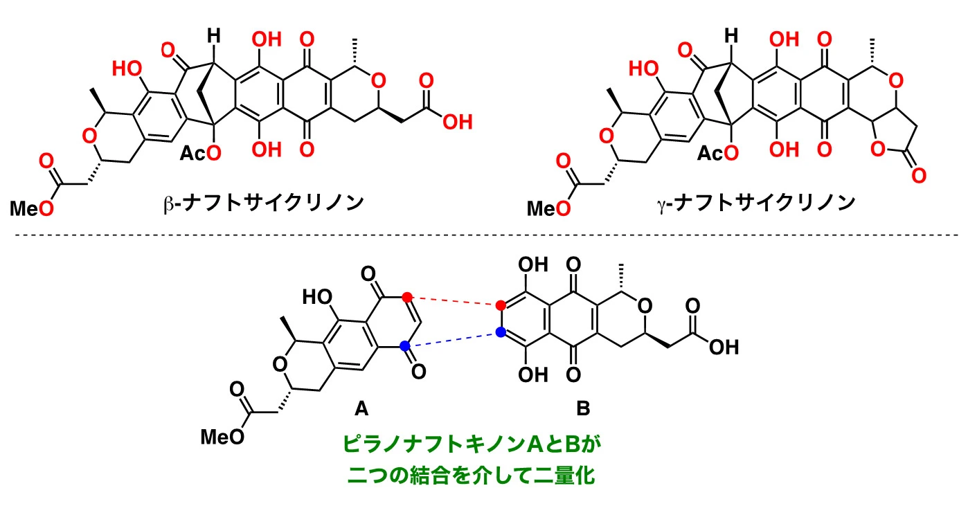 左右の単量体構造(ピラノナフトキノン)AおよびBの持つ官能基はわずかに異なっています(青と赤で対比)。これらの違いを化学反応により選択的に整えていくことは簡単ではありません。