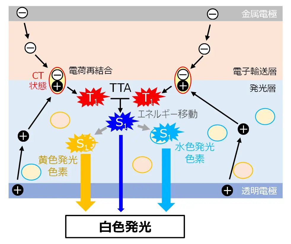 伊澤准教授らの研究チームでは、これまでに2種類の有機分子の界面におけるアップコンバージョン過程を利用することで、青色有機ELの低電圧化に成功してきました。アップコンバージョン有機EL(UC-OLED)の発光メカニズム(図2)においては、はじめに、注入された電子と正孔(ホール)が電子ドナー/アクセプター分子の界面で再結合することによって電荷移動(CT)状態という励起状態を形成します。続いて、CT状態から電子移動が起こり、ドナー層中で三重項励起状態(T1)[用語3]が生成されます。その後、2つのT1から、三重項―三重項消滅(TTA)により高エネルギーの一重項励起状態(S1)[用語3a]が生成し、青色発光が得られます。本メカニズムを用いることで、従来素子の約半分の電圧である1.5 V以下で青色発光を得られるようになりました。TTAで作り出した青色の励起状態のエネルギーは、低エネルギーの緑・黄・赤などの発光色素に移動可能なため、適切な色素の混合により低電圧で白色発光するUC-OLEDの開発ができると期待されてきました。