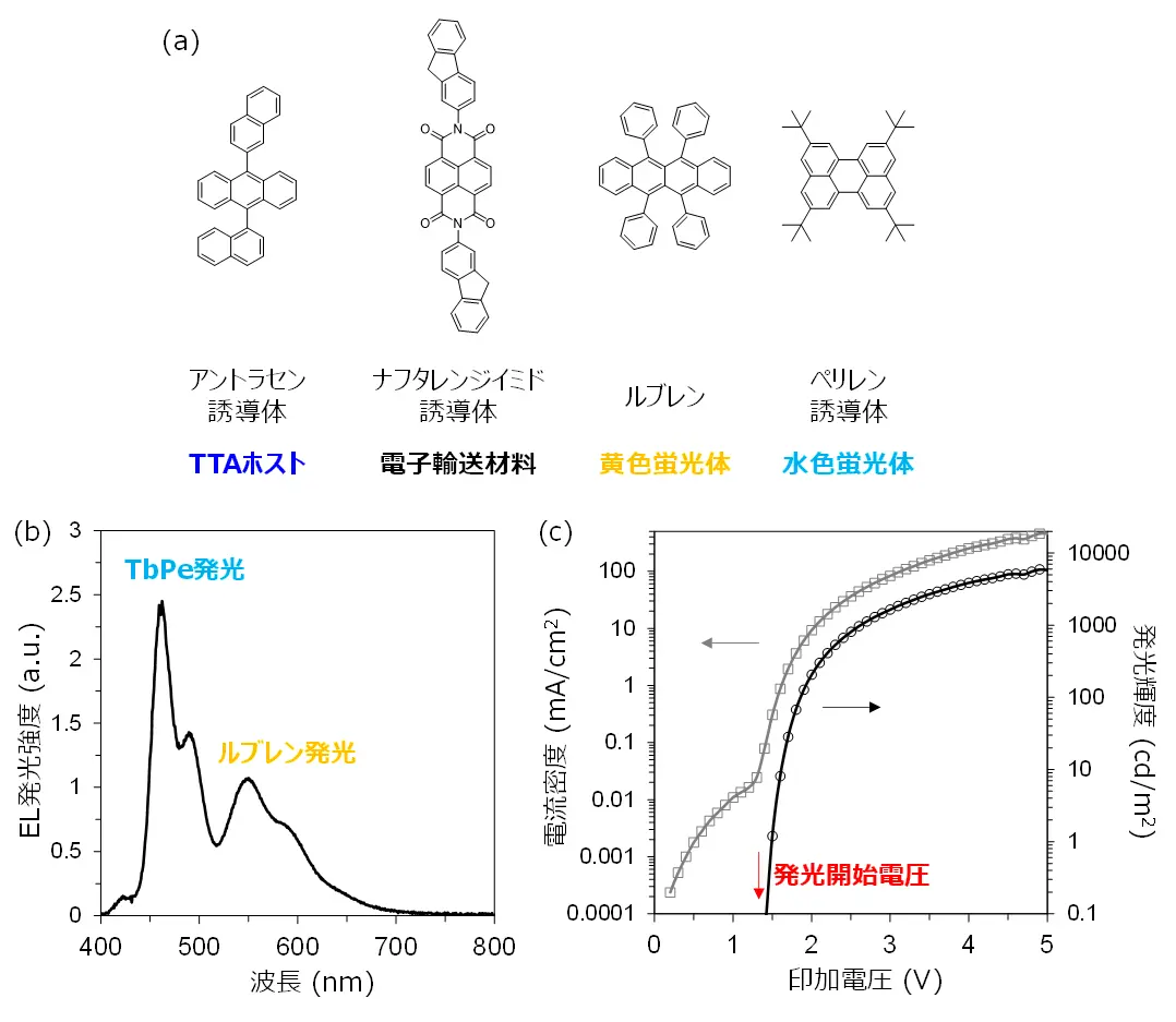 本研究では、低電圧で発光可能な青色UC-OLEDに水色とその補色である黄色の発光色素を加えることで、乾電池1本相当の電圧である1.5 V以下で発光できる白色有機ELを開発しました。TTAを起こす発光材料には市販の有機ELなどでも用いられる典型的な青色発光体であるアントラセン誘導体(図3a)を用い、アントラセン誘導体と界面を形成する電子輸送材料にはナフタレンジイミド誘導体(図3a)を用いました。さらにアントラセン誘導体がホスト材料として機能する発光層に、黄色(青色の補色)の蛍光体であるルブレン(図3a)を少量ドープしました。まずアントラセン発光層にルブレンのみを加えた場合には、黄色の発光が支配的となり、白色発光とはなりませんでした。この要因を明らかにするために時間分解蛍光測定を行ったところ、アントラセンの青色発光が生じる速さよりも、アントラセンからルブレンへエネルギーが移動する速度が十分に速いことがわかり、そのためにほとんどの発光が黄色となってしまうことがわかりました。そこで、アントラセン発光層に黄色発光のルブレンだけでなく、水色発光のTbPe(図3a)も加えたUC-OLEDを作製しました。このダブルドープのUC-OLEDでは、水色と黄色の発光の割合を、ドープ濃度の調整によりアントラセンホストからTbPeとルブレンへのエネルギー移動速度で制御することができます。そのため、TbPeの水色(470 nm付近)とルブレンの黄色(560 nm付近)の発光の混色により、UC-OLEDで白色発光を実現することができました(図3b)。またこれら2種類の蛍光体はUC-OLEDの電荷輸送特性を損ねることがなかったため、以前に報告した超低電圧発光の青色UC-OLEDと同様に1.5 V付近の電圧から発光が認められました(図3c)。その結果、図1のように、乾電池1本(1.5 V)をつなげるだけで白色発光を得ることができ、世界最小電圧で光る白色有機ELの開発に成功しました。