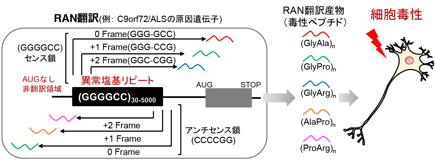 筋萎縮性側索硬化症(ALS)は運動神経が変性し、全身の筋肉が急速に衰えていく難病指定されている神経変性疾患です。前頭側頭型認知症(FTD)は、アルツハイマー型認知症やレビー小体型認知症に次いで多い認知症で言語障害などを引き起こす神経変性疾患として知られています。これらの疾患で高頻度に見られる遺伝変異として、C9orf72遺伝子内に存在するGGGGCCという6つの塩基からなる配列の異常な繰り返しが検出されていました。この繰り返し(リピート)配列を持つRNAでは、教科書的な翻訳開始機構に依らないRAN翻訳(図1)と呼ばれる異常なタンパク質合成が発生することが知られています。このRAN翻訳で合成されるタンパク質は細胞毒性を持っており、神経細胞の機能障害や細胞死を誘発するため病態との関連が示唆されています。RAN翻訳について分子機構の解析は行われているものの、その詳しいメカニズムや制御因子についてはよく分かっていませんでした。