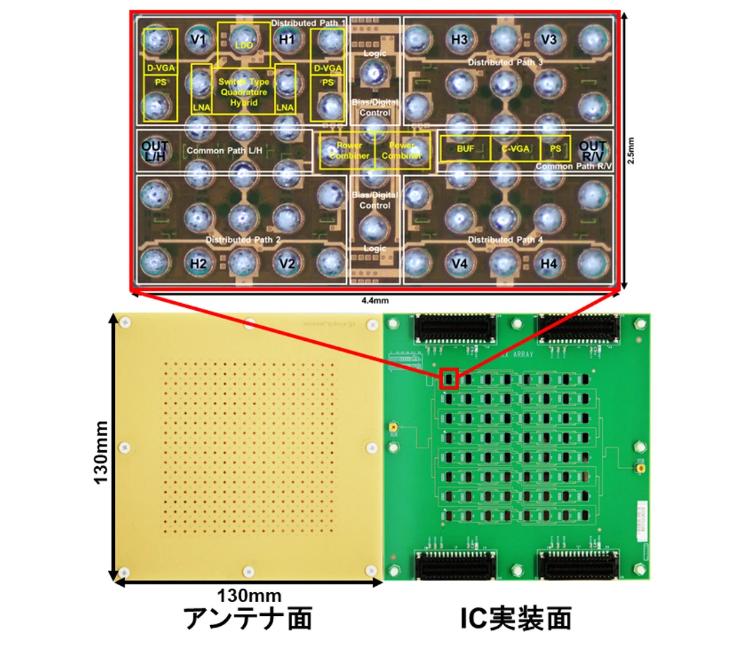 - 「スイッチ型90度カプラー回路」を新たに考案し、チップ内部で右旋および左旋円偏波信号を取り出し、独立に位相制御することで従来の2倍のビーム数を実現。