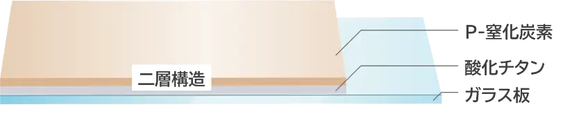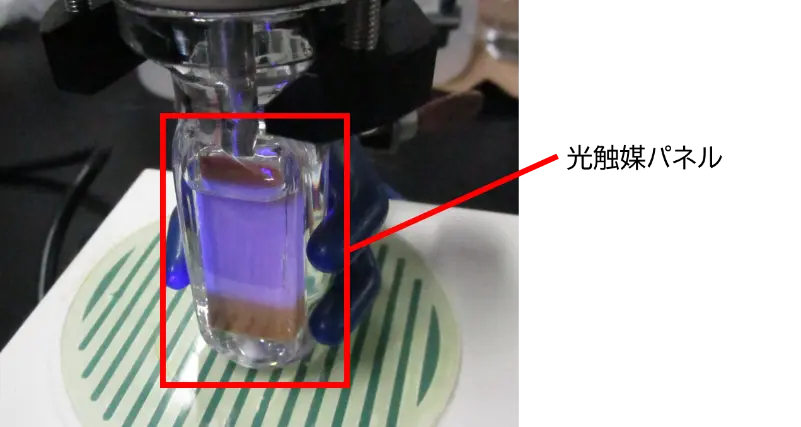 - ホウケイ酸ガラス平板上に光触媒を固定化するため、金属酸化物(酸化チタン)層を生成し、その上に可視光を吸収する有機半導体である窒化炭素の層を重ねる二層構造を採用。これを固定化することで、人工光触媒のパネル化を実現
