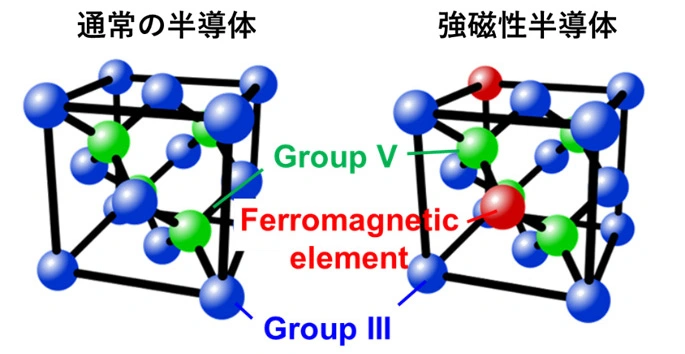 磁性材料と半導体材料の特長を融合できる新材料として、強磁性半導体は特に重要な材料系であり、注目を集めています。図1に示すように、強磁性半導体は非磁性半導体の一部の原子が磁性原子で置換された半導体であり、既存の半導体結晶成長技術とデバイスプロセス技術と極めて高い親和性を持つ上、電界効果や光照射による磁気特性の変調など、従来の半導体や強磁性金属では得られない機能を有する材料でもあります。さらに、強磁性半導体は単結晶かつエピタキシャル成長可能であるため、膜厚を原子レベルで制御することが可能である点も特徴です。