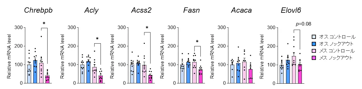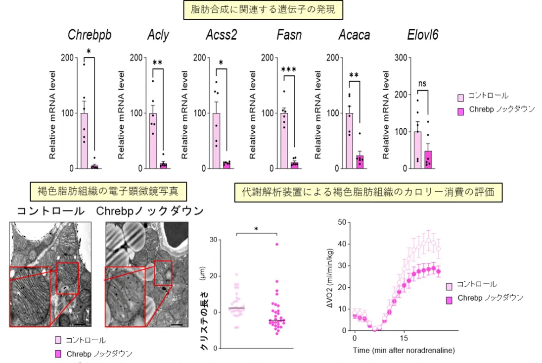 この原因を探るため、遺伝子発現の変化を網羅的に解析した結果、Chrebpβ[用語5]およびその下流の脂肪合成に関連する遺伝子の発現が、メスのノックアウトマウスでのみ低下していることが判明しました(図3)。次に、メスのBATにおいてChrebpβをノックダウン(抑制)すると、脂肪合成に関連する遺伝子の発現が減少し、クリステの短縮ともに、BATのカロリー消費能が低下することが確認されました(図4)。
