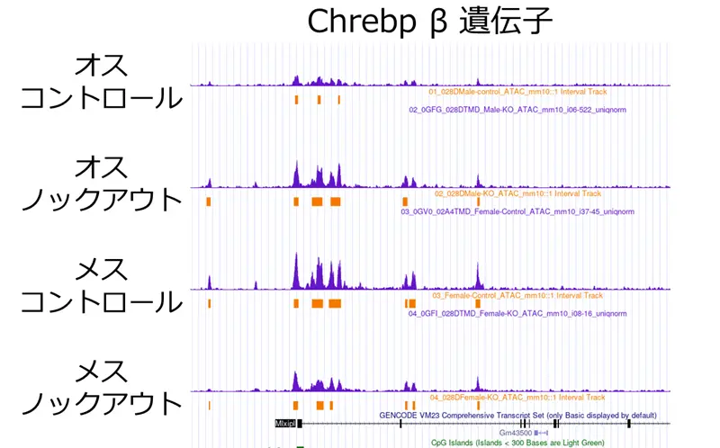 次に、PGC-1αがメス特異的にChrebpβの転写調節に関与している仕組みを明らかにするため、ATACシークエンスを用いてゲノム全体のクロマチンアクセシビリティ[用語6]を評価しました。その結果、Chrebpβの転写開始部位近傍におけるクロマチンアクセシビリティは、メスのBATでオスよりも高く、PGC-1αノックアウトマウスではこの性差が消失していました(図6)。つまり、PGC-1αはメス特異的にChrebpβ遺伝子座のクロマチンを開いた状態に保つことで、同遺伝子の発現を促進していることが示されました。