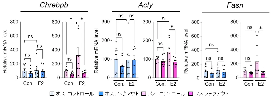 さらに、エストロゲンがメスマウスのBATにおいてのみChrebpβおよび脂肪合成に関連する遺伝子の発現を増加させること、そしてその作用がPGC-1αに依存していることも明らかになりました(図7)。