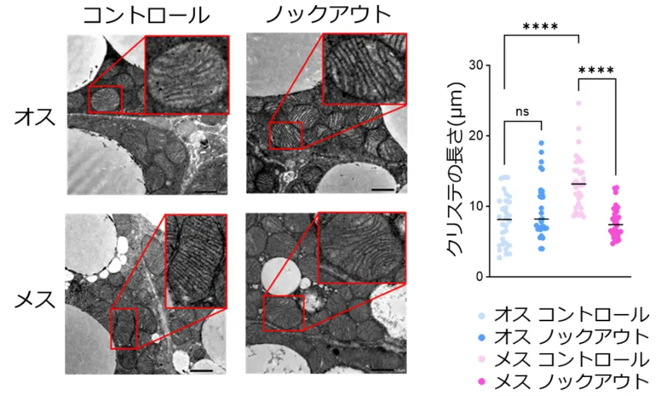 まず、BATの熱産生活性およびカロリー消費能が、オスマウスよりもメスマウスで高いことを確認しました。次に、両性のマウスにおいて脂肪細胞でPGC-1αをノックアウト(除去)したところ、メスでのみミトコンドリアの構造変化(クリステ[用語4]の短縮、図1)およびBATの熱産生・カロリー消費能の低下(図2)が見られました。