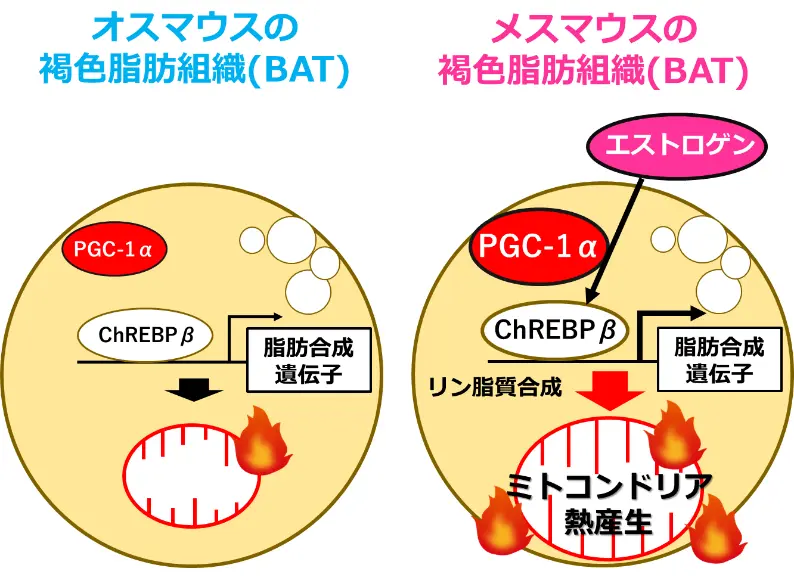 ペルオキシソーム増殖因子活性化受容体γ共活性化因子1α(PGC-1α)は、ミトコンドリアのエネルギー代謝を制御する重要なタンパク質であり、BATにおける熱産生を調節しています。本研究では、BATにおけるPGC-1αの機能に性差があることを発見しました。さらに、メスマウスのBATでは、PGC-1αがオスとは異なる独自のメカニズムによって熱産生およびカロリー消費の調節を促進し、全身のカロリー消費を高める役割を果たしていることを明らかにしました。