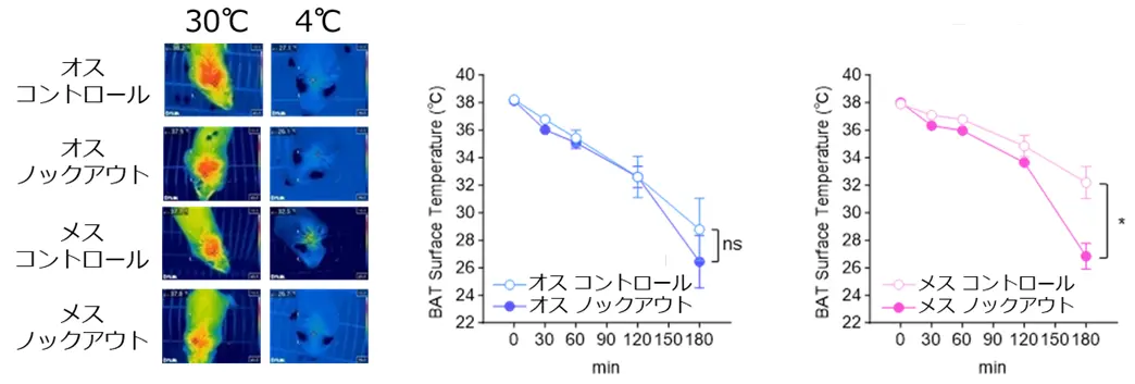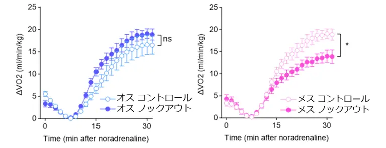 この知見は、個体のカロリー消費における性差に対する新たな理解を促すものです。また、肥満症や肥満に伴う糖尿病は、我が国のみならず世界的にも増加しており、深刻な健康問題の要因となるだけでなく、大きな社会問題ともなっていますが、その予防や改善は容易ではありません。今回得られた知見を発展させることにより、食事療法の実施に加えて、カロリー消費を促進することで肥満症や肥満に伴う糖尿病を予防・改善する手法や、新規薬剤の開発につながることが期待されます。