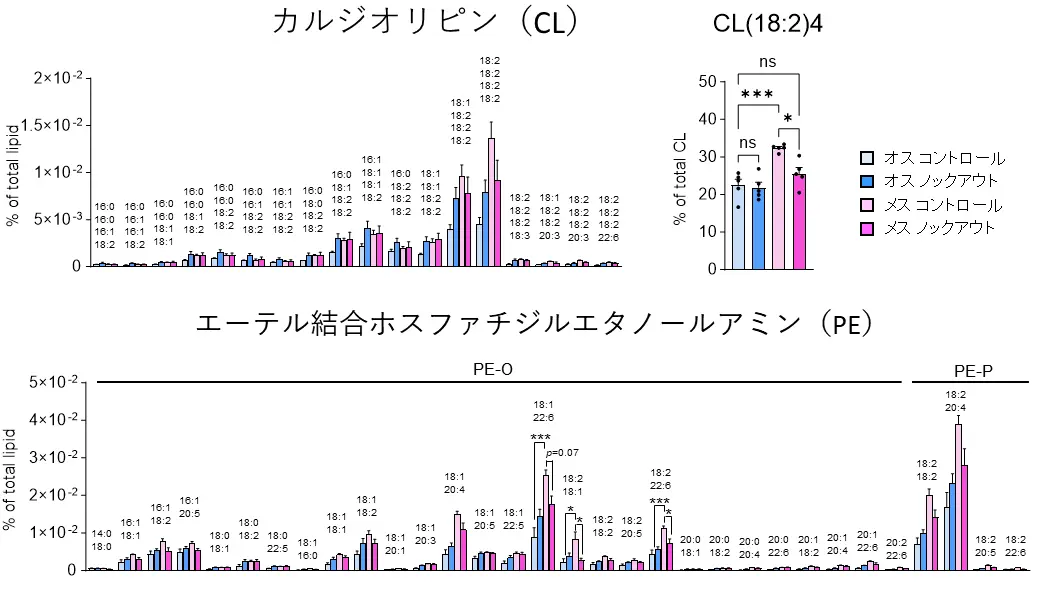 さらに、BATの脂質構成を質量分析計により網羅的に解析したところ、PGC-1αをノックアウトすることで、メスマウスにおいてのみ、ミトコンドリアの構造や機能維持に重要なリン脂質(エーテル結合ホスファチジルエタノールアミン(PE)やカルジオリピン(CL)など)が減少することが明らかとなりました(図5)。