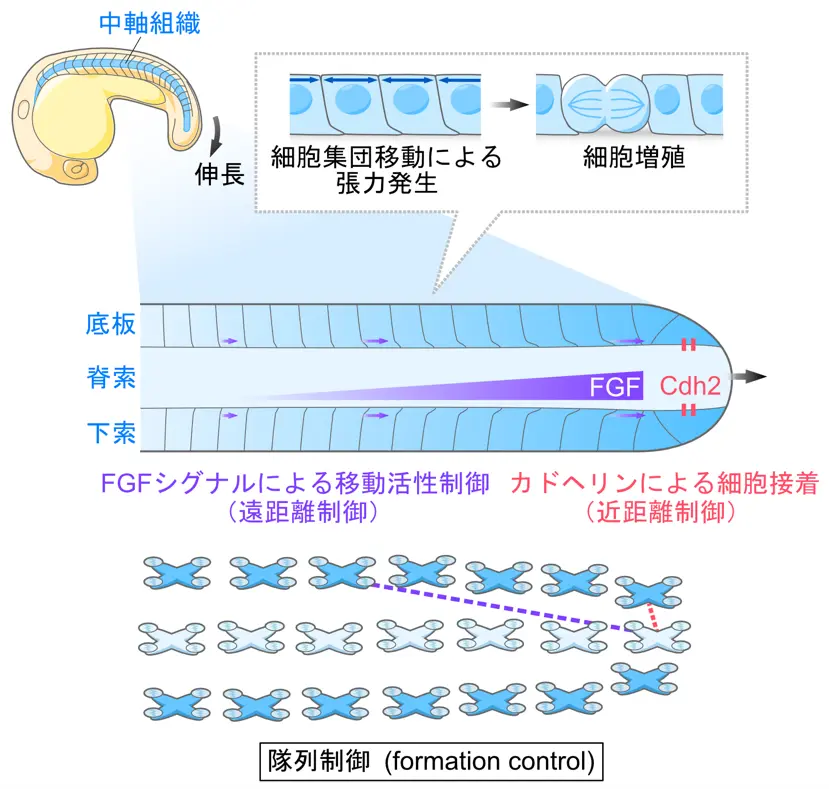 以上の実験データをもとに数理モデルを作り、シミュレーションを行ったところ、底板と下索の細胞が集団移動して脊索を追いかけると同時に組織間接着によって移動速度を微調整すれば、3つの組織が整列した状態を保ちながら伸長できることが再現されました。これらの結果は、異なる構造と成長様式を持つ複数の組織が、リーダー(脊索)とそれに追従するフォロワー(底板と下索)から構成される「隊列制御(formation control)」によって協調的に伸長していくという、新たな発生原理を示すものです。特に、FGFシグナルによる遠距離からの制御とCdh2による近距離での機械的連結という、空間スケールの異なる2つの調節機構が組み合わさって制御する点が本研究の大きな発見です。