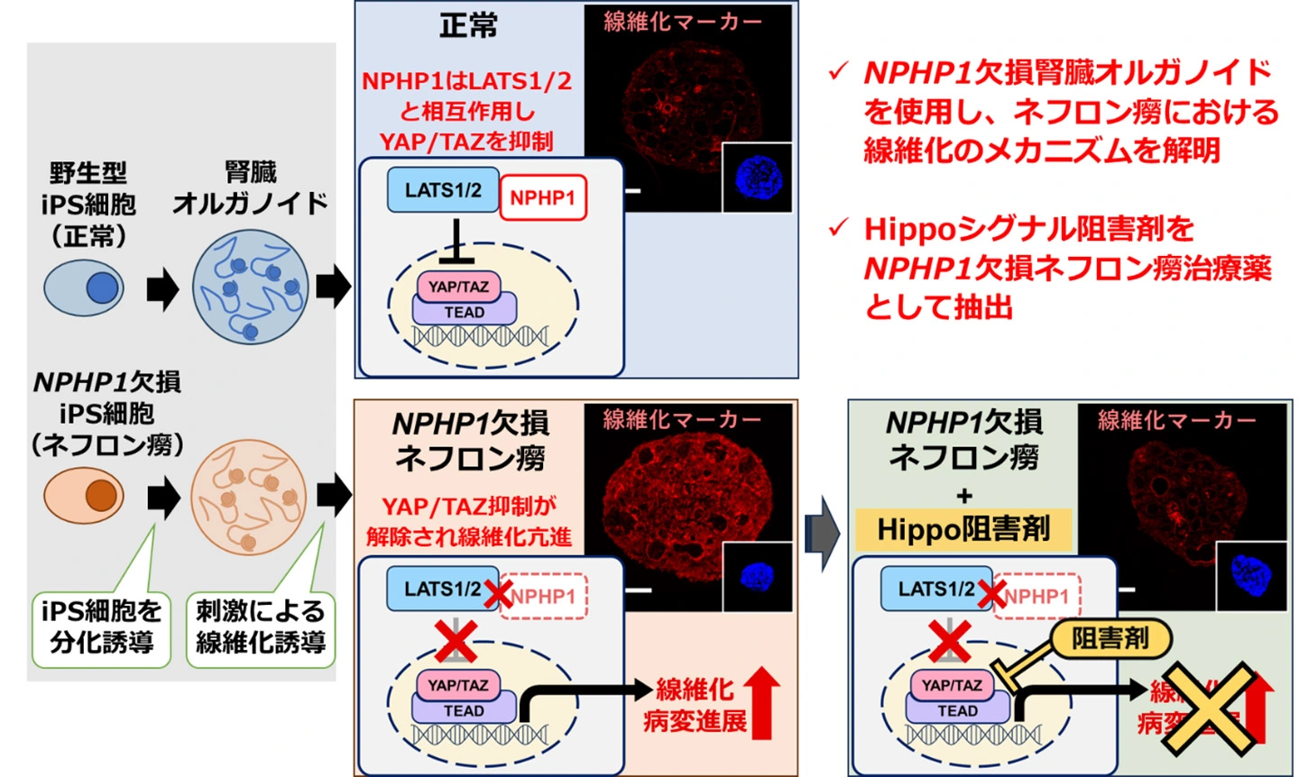 - 指定難病である遺伝性疾患ネフロン癆(ろう)において、Hippoシグナルが腎線維化の進行に関与し、Hippoシグナル阻害剤で抑制できることを解明。