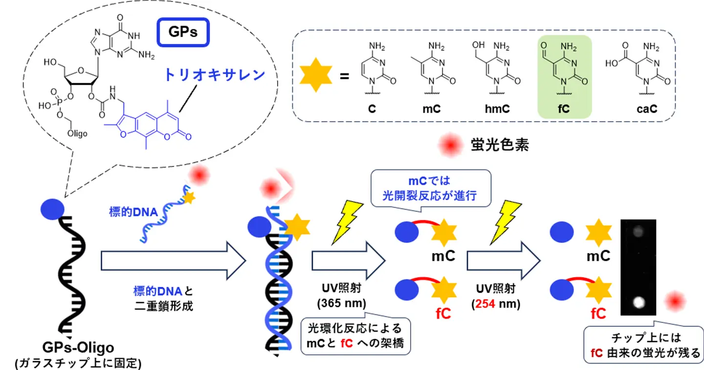 東京科学大学(Science Tokyo) 生命理工学院 生命理工学系の山吉麻子教授、三瓶悠助教、白濱裕章大学院生らの研究チームは、DNA中の特定の化学修飾を光によって識別する新たな解析技術を開発しました。本研究では、光架橋性分子であるトリオキサレン[用語1]を導入した新規ヌクレオシド(GPs)を新たに設計・合成し、これを搭載した光検出プローブ(GPs-Oligo)が、DNA修飾の一種である5-ホルミルシトシン(5fC)[用語2]に対してユニークな光反応性を示すことを見出しました。[参考文献1-2]