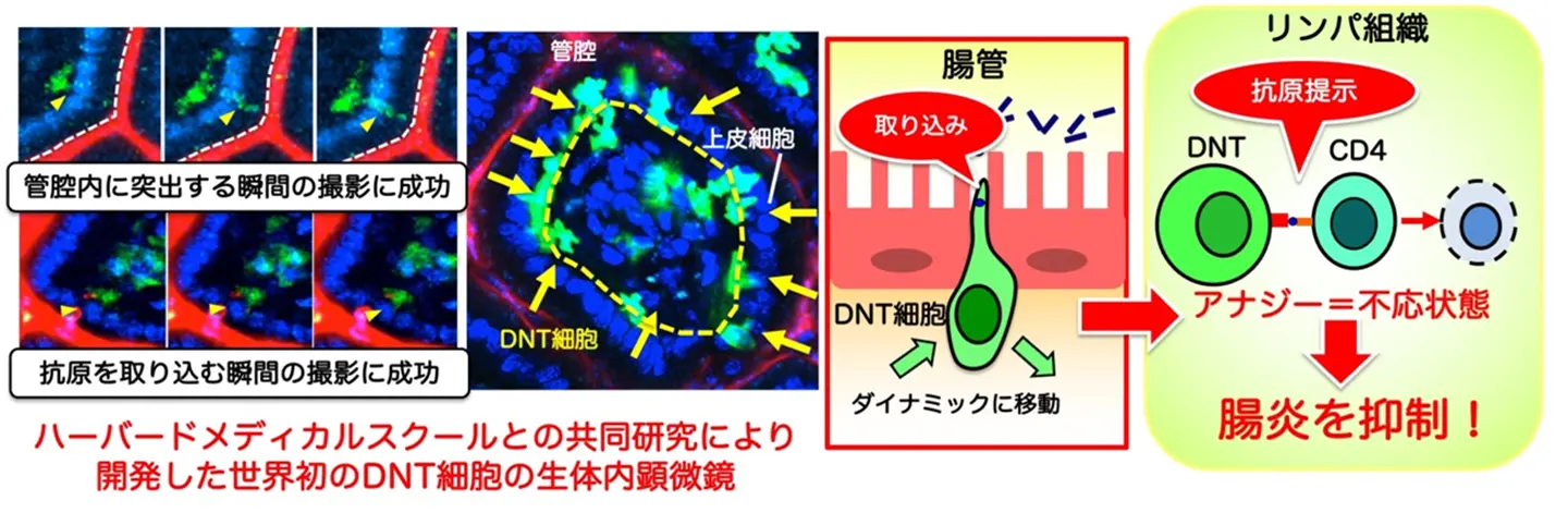 - 生体顕微鏡観察を用いた共同研究により、DNT細胞の腸内での動きや抗原取り込みの様子を時空間的に可視化することに世界で初めて成功しました。