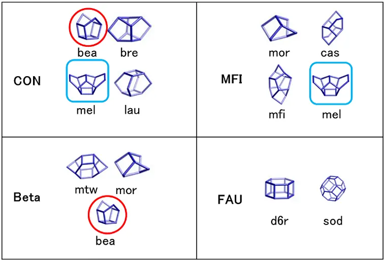 図2. 目的ゼオライトであるCON型ゼオライトのCBUと、出発原料として検討した各種ゼオライトのCBU。赤線で囲っているCBUはCONとBetaで共通しているCBU、青線で囲っているCBUはCONとMFIで共通しているCBUを示している。