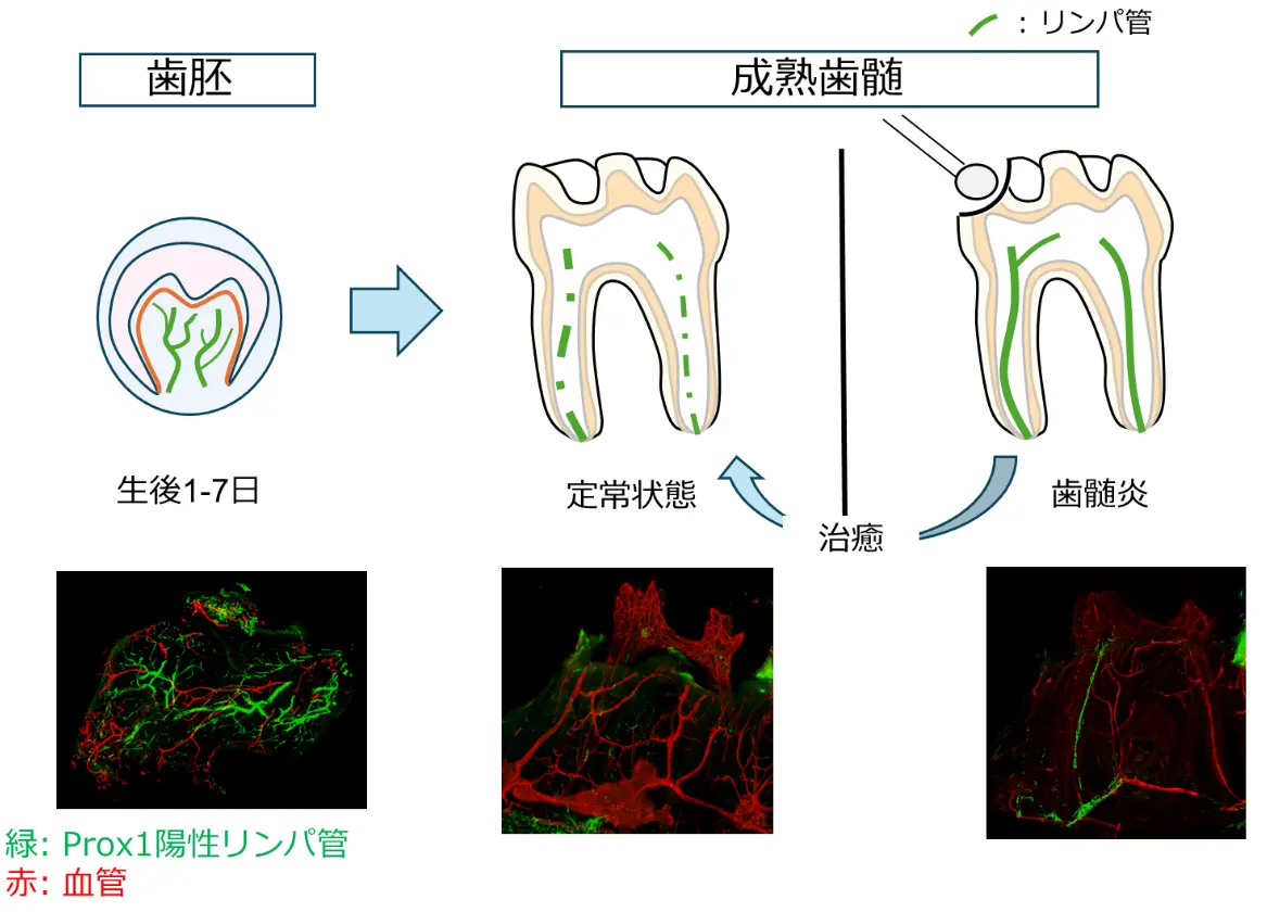 これまでその存在が明確にされていなかった「歯の中のリンパ管」を可視化し、その変化のしくみを明らかにした本研究は、歯髓の恒常性維持や病態の理解に新たな知見を提供しました。