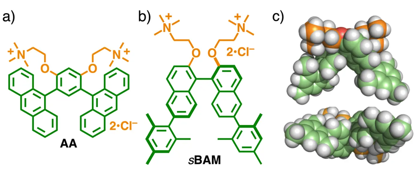これまでに吉沢らの研究グループは、非キラルな湾曲型の両親媒性分子AA(図1a)が水中で集合して、ミセル型のカプセルが形成することを明らかにしています。また、その芳香環空間は、さまざまな有機色素や金属含有色素を効率的に内包できます[参考文献1]。そこで本研究では、高い分子内包能を持つ芳香環キラル空間の構築を目指し、新たにキラルな湾曲型の両親媒性分子sBAM(図1b、c)を設計・合成しました。この分子は、1つの軸不斉な芳香環骨格のビナフチルと2つの親水側鎖を持ち、水中でミセル型のキラルカプセルを定量的に形成しました。また、このカプセルをナノ道具として活用することで、汎用的な種々の金属含有色素を効率的に取り込むとともに、特異なキラル空間機能が発現することを明らかにしました。