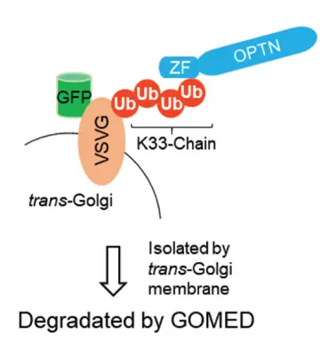 細胞内でタンパク質を分解する際、その基質を認識する分子として、これまでに5種類のタンパク質が知られていました。私たちは、この5種類のいずれかがGOMEDに関与すると考え解析を行った結果、オプチニューリン(OPTN)が重要であることを見出しました。さらに、OPTNが何を目印にして基質を認識しているのかを検討したところ、ユビキチン分子(Ub)が形成する「K33鎖」が目印として機能していることを突き止めました。