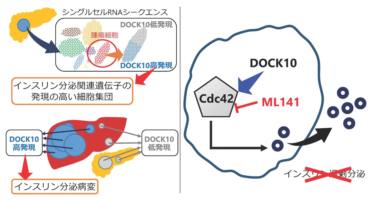 さらに、転移先でインスリン分泌能を失った腫瘍と、分泌能を維持した腫瘍を比較した免疫染色による解析に加え、インスリノーマとしては初となるシングルセルRNAシークエンス[用語3]を行った結果、インスリン分泌病変を特異的に標識する新規遺伝子DOCK10[用語4]を同定しました。