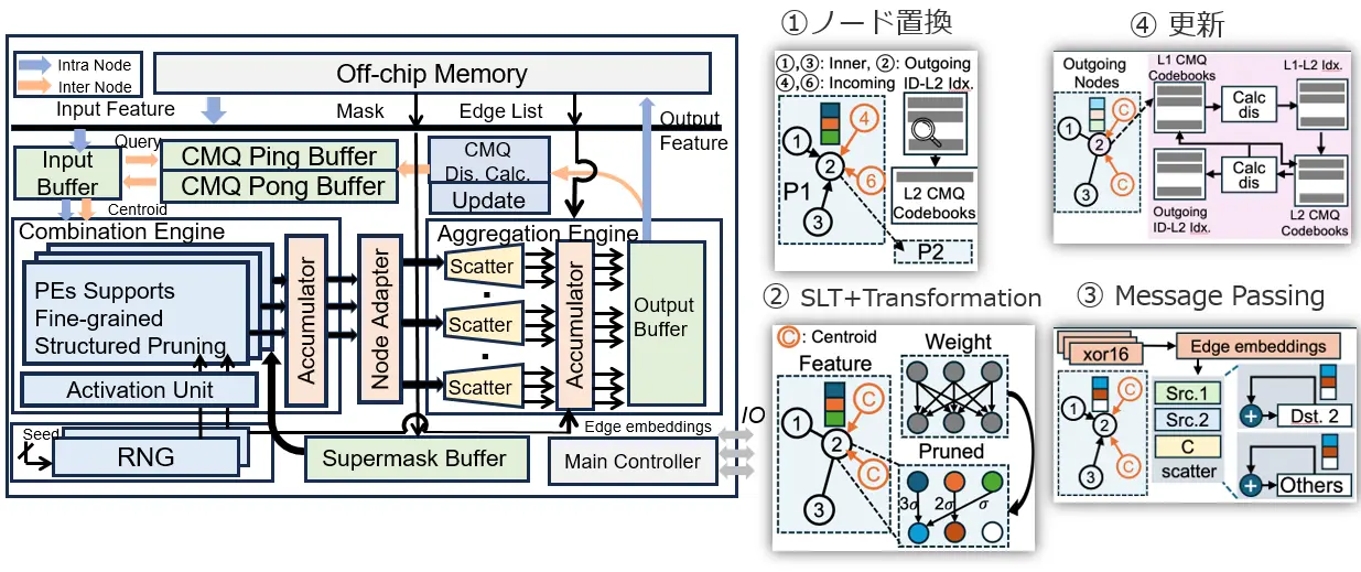今回開発したBingoGCNは、この課題を解決するために、CMQとStrong Lottery Ticket (SLT) 理論[用語3]という二つの新しい技術を搭載しています。CMQは、グラフデータを小さな塊(パーティション)に分割して処理する際に、パーティション間でやり取りされる情報を「オンラインベクトル量子化[用語4]」という技術で要約します。これにより、不規則なメモリアクセスを大幅に減らし、処理の精度を保ちながら効率を向上させます。また、SLT理論ではAIモデルの計算に必要な「重み」と呼ばれるパラメータを、必要な時に必要な分だけチップ上で生成します。これにより、メモリ使用量を削減し、計算効率を大幅に高めます。BingoGCNは、これらの技術を組み合わせることで、従来難しかった細かく分割されたグラフデータ上でも、高い効率でGNNの推論[用語5]を行うことを可能にしました。