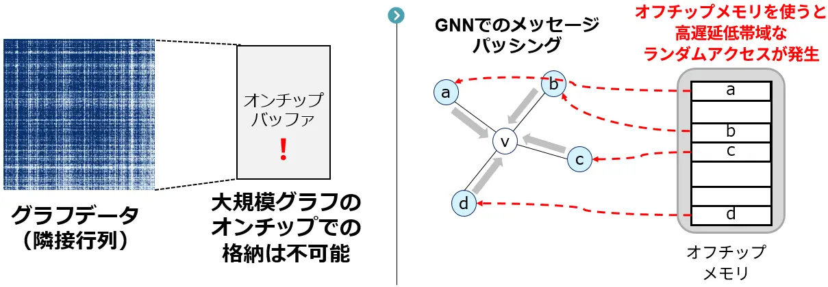 しかし、このGNNを実際のシステムで活用する際、特に大規模なデータをリアルタイムに処理しようとすると、いくつかの大きな課題に直面します。具体的には、GNNが扱うデータ(ノード特徴量[用語6]や隣接行列[用語7]といったグラフ構造を表す情報)は非常にサイズが大きくなることが挙げられます。そのため、データをメインメモリから読み書きする際の通信量や、チップ上で一時的にデータを保存しておくバッファのサイズが膨大になり、処理速度の低下やコストの増大を招きます。この問題は、メモリアクセスパターンが不規則であるGNNにおいて特に顕著に表れます。