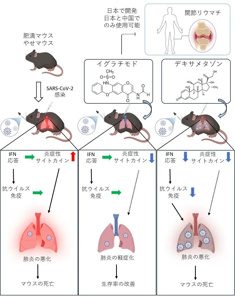 - 肥満マウスはSARS-CoV-2感染すると早期に死亡するが、抗リウマチ薬「イグラチモド」の治療により、生存率が有意に改善することを発見した